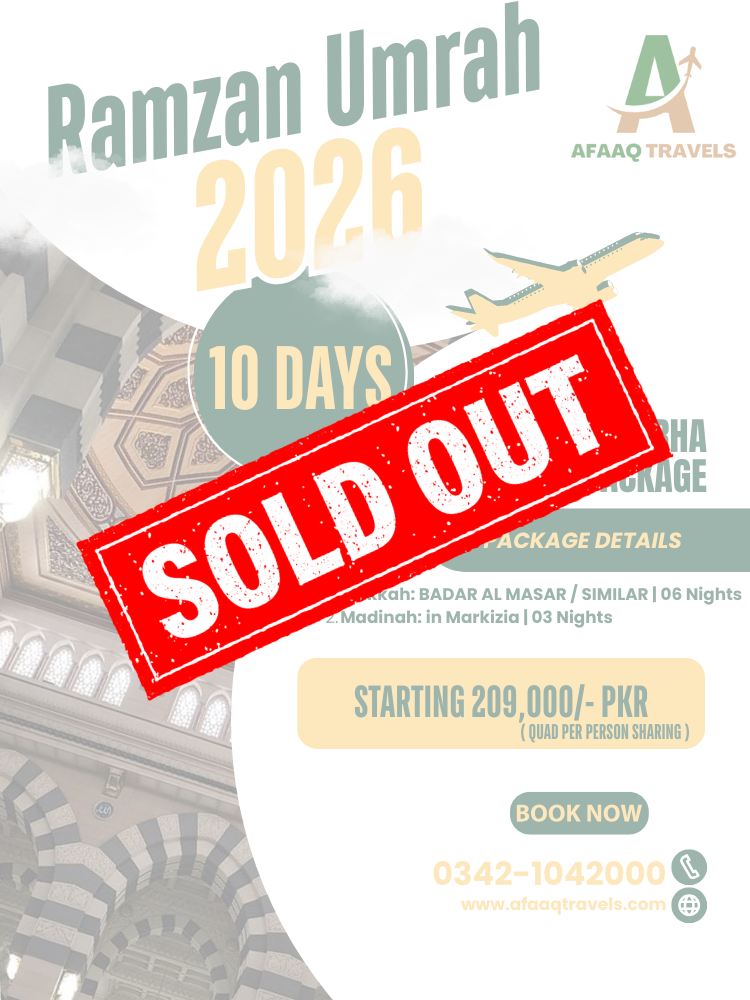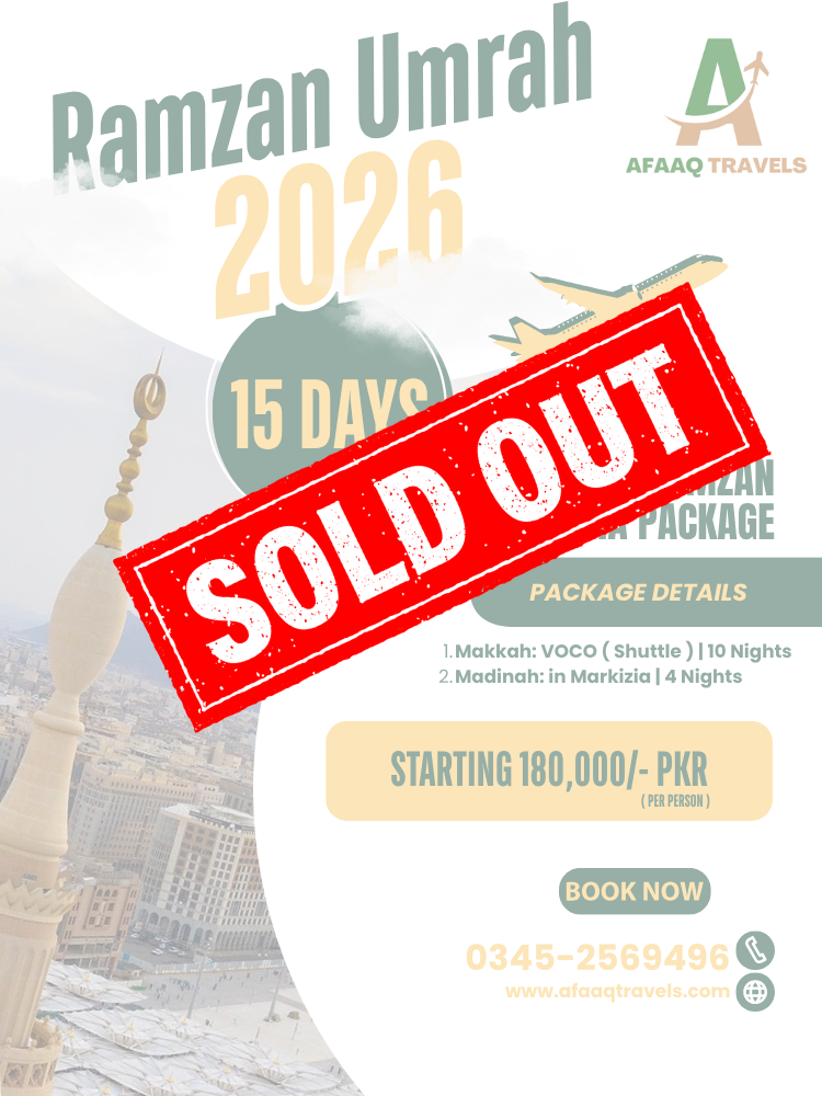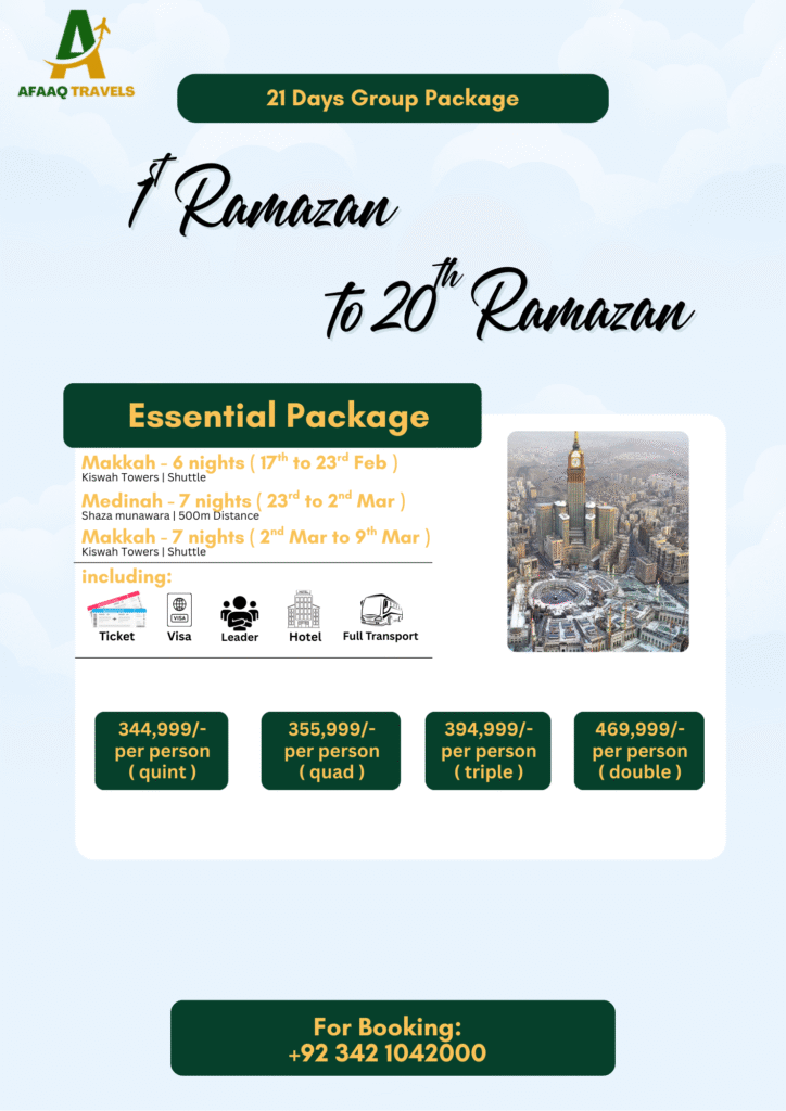 Afaaq Travels brings you exclusive Ramzan Umrah Packages 2026 from Pakistan with options for the 1st, 2nd, and 3rd Ashra. We provide 10, 14, and 30 days packages that include visa processing, direct flights, premium hotels close to Haram, and reliable transport services. Our team ensures a smooth spiritual journey so you can focus on your Ibadah during the blessed month of Ramzan.